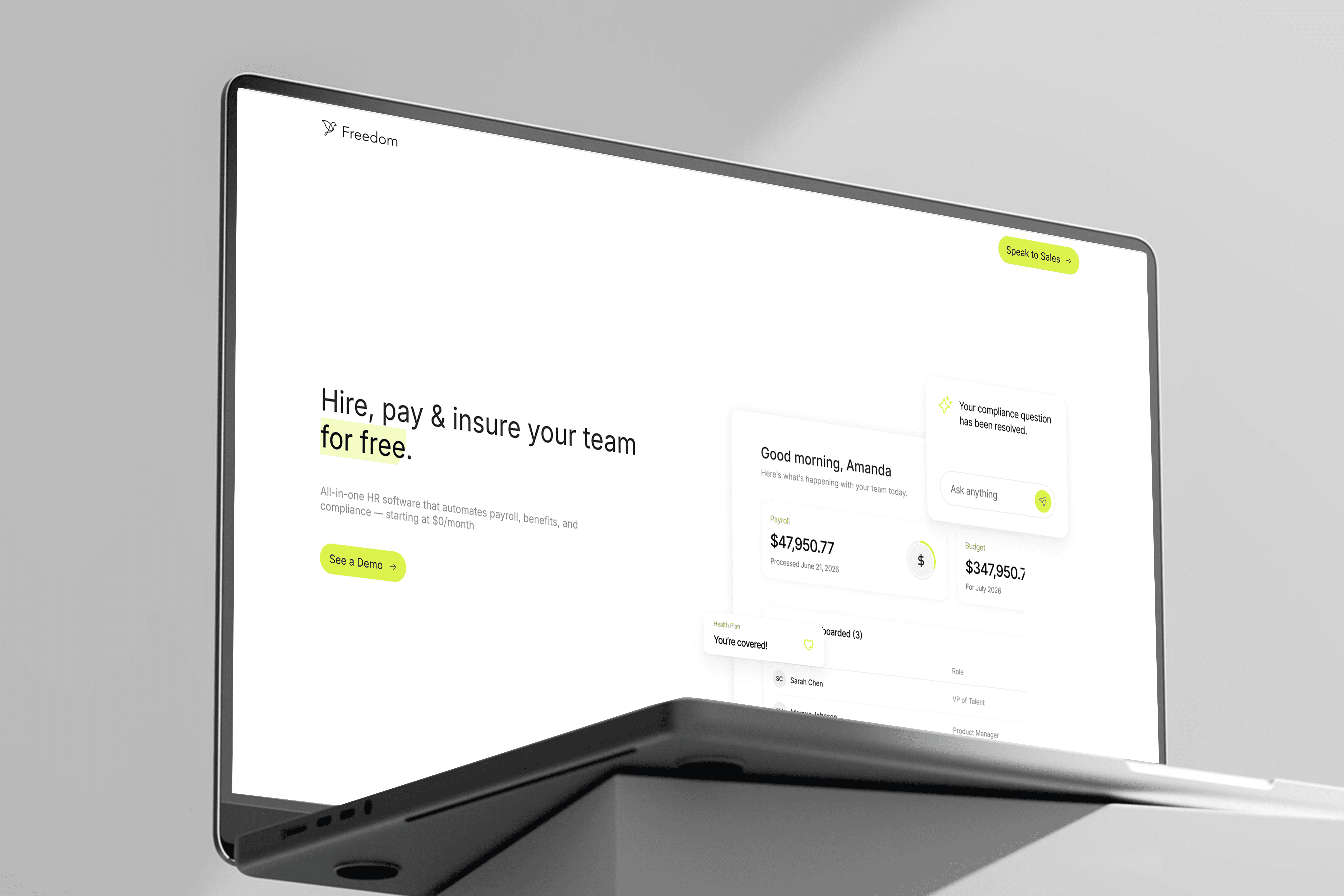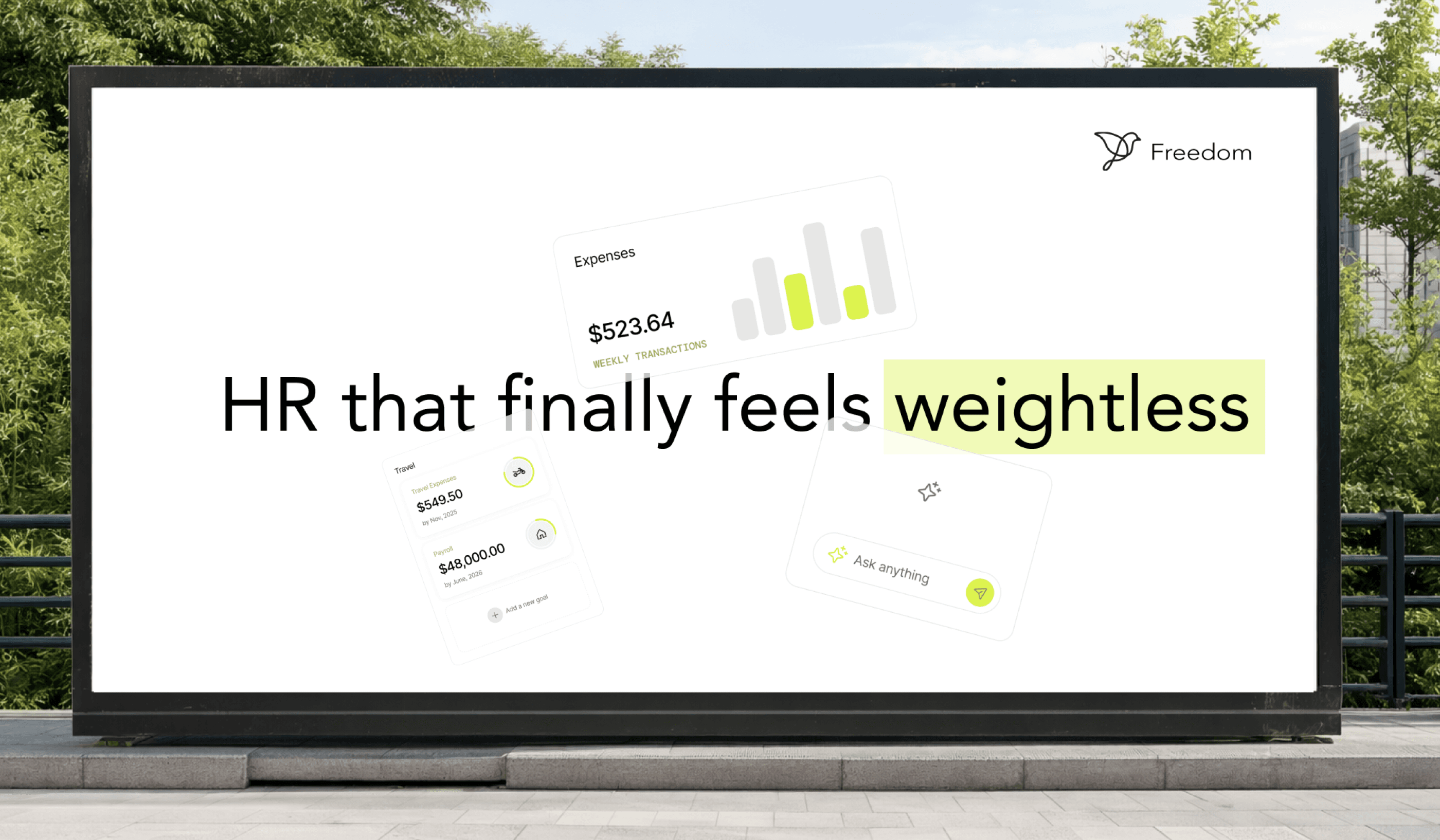 Freedom is an HR platform designed to remove operational friction for growing teams. The goal of this project was to create a brand system that communicates clarity, simplicity, and reliability while reflecting the product’s core promise: making payroll, benefits, and compliance effortless. The visual language emphasizes lightweight structure, strong contrast, and minimalism to mirror the product experience.